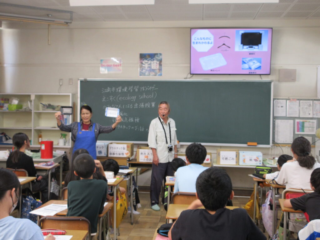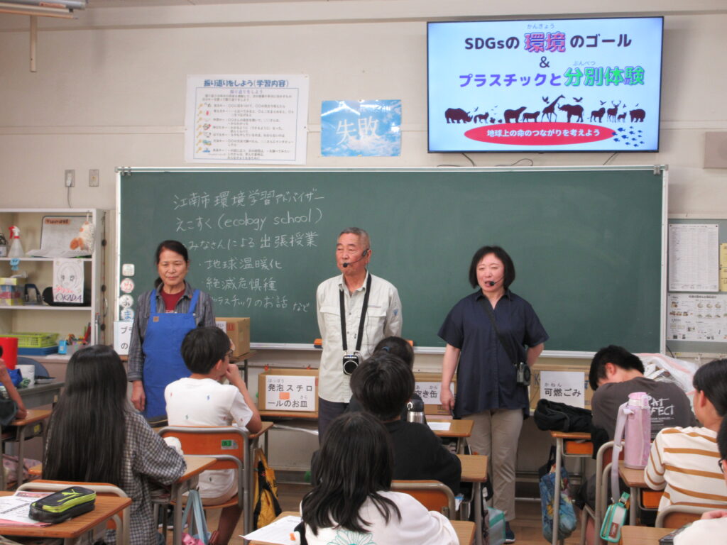 えこすくのメンバーが講師となり、市内の小学校6年生の教室で「SDGsの環境ゴール」と「プラスチックのお話と分別体験」を組み合わせた授業を行いました。